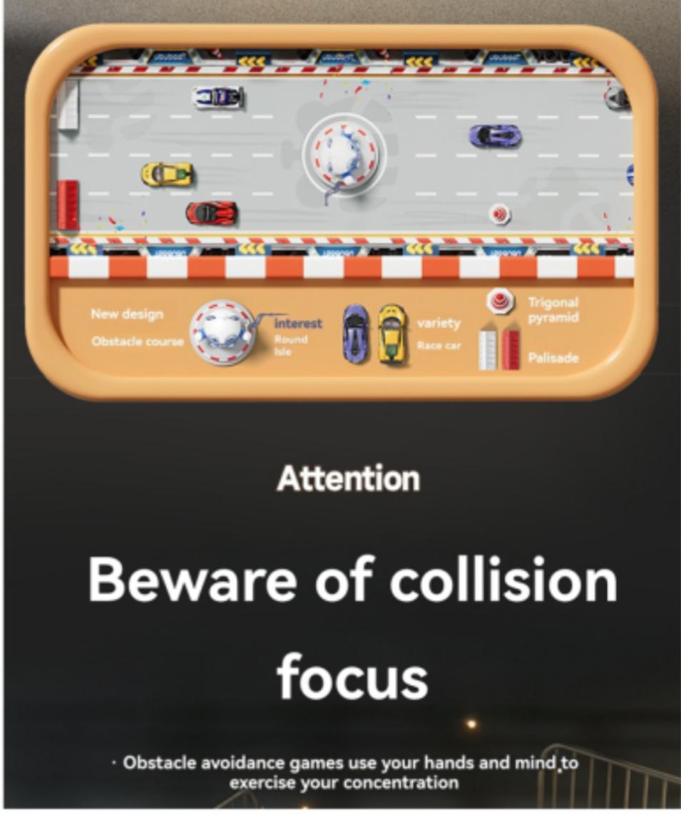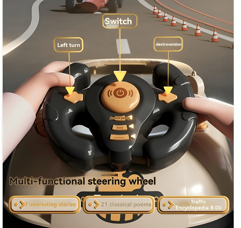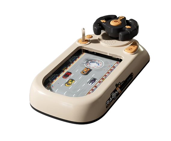 Children’s steering wheel operation obstacle avoidance game machine simulates steering wheel racing car.