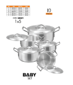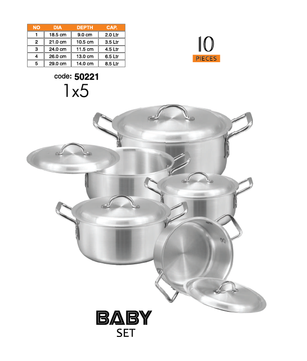 The Sonex Baby Set (Size 1-5) is a compact and versatile cookware collection, perfect for everyday cooking needs. This set includes five pots of varying sizes, designed to cater to small to medium meal preparations.